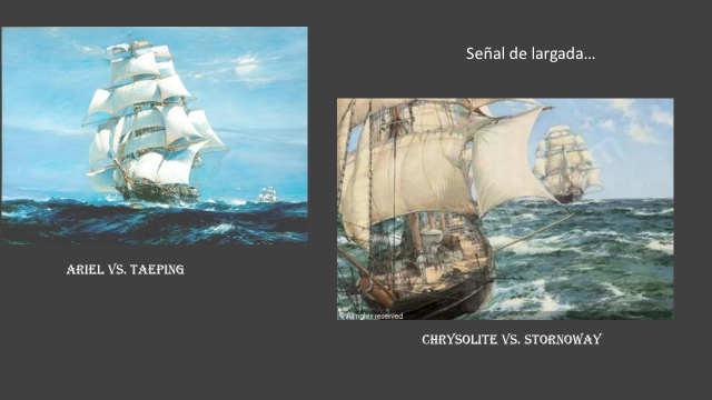 Taeping, Ariel, Stornoway, Chrysolite, Flying Cloud y otros, batieron duros duelos de mar que pusieron a prueba las embarcaciones y tripulaciones cuyos capitanes intrépidos mostraron su arrojo y valentía junto con su pericia.