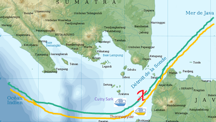 En 1872, el 26 de junio, parten de Shangai con destino a Londres. El Cutty Sark toma ventaja sobre el Thermopilae hasta que llegan al Estrecho de la Sonda en Indonesia, que en sus partes más orientales muestra profundidades de no más de 20 m con muchos bancos de arena y fuertes corrientes. Probablemente por estas condiciones, el Cutty Sark daña su timón, perdiendo el liderazgo a favor del Thermopilae.
