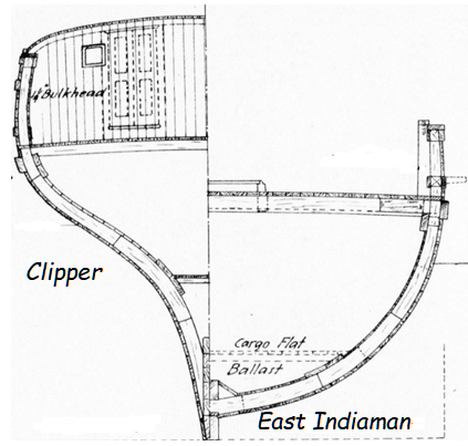 Los cascos de mayor eslora, y menor manga, más estilizados y conforma de “V” o de “corazón” facilitan el empuje hacia avante por las fuerzas laterales y las proas “cortantes” con popas con mayor escape. Todo facilitaba la velocidad en comparación con los “redondos” Eastindiaman.